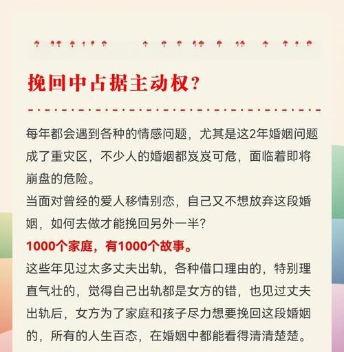婚姻中出现变故,一方的变心往往是最让人痛苦的。对于聪明的女人来说,挽回老公的心并不是一件不可能的事情。本文将从心理、行动和沟通三个方面,为你呈现一份挽回老公的秘籍。